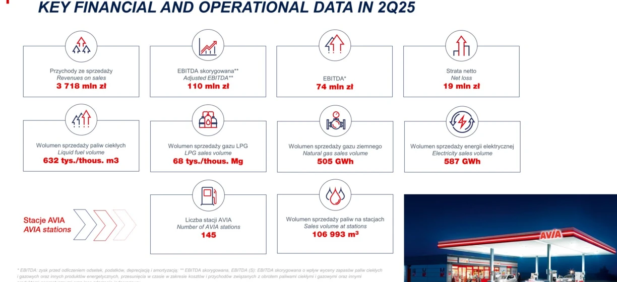 Jeśli chodzi o wyniki operacyjne, Grupa Unimot wypracowała w II kwartale 2025 r. wolumen sprzedaży paliw ciekłych na poziomie 632 tys. m sześc., wolumen sprzedaży gazu LPG na poziomie 68 tys. ton, wolumen sprzedaży gazu ziemnego na poziomie 505 GWh i wolumen sprzedaży energii elektrycznej na poziomie 587 GWh. Na koniec II kwartału 2025 r. w sieci AVIA działało 145 stacji, a wolumen paliwa sprzedanego na stacjach wyniósł w raportowanym okresie 106 993 m sześc.