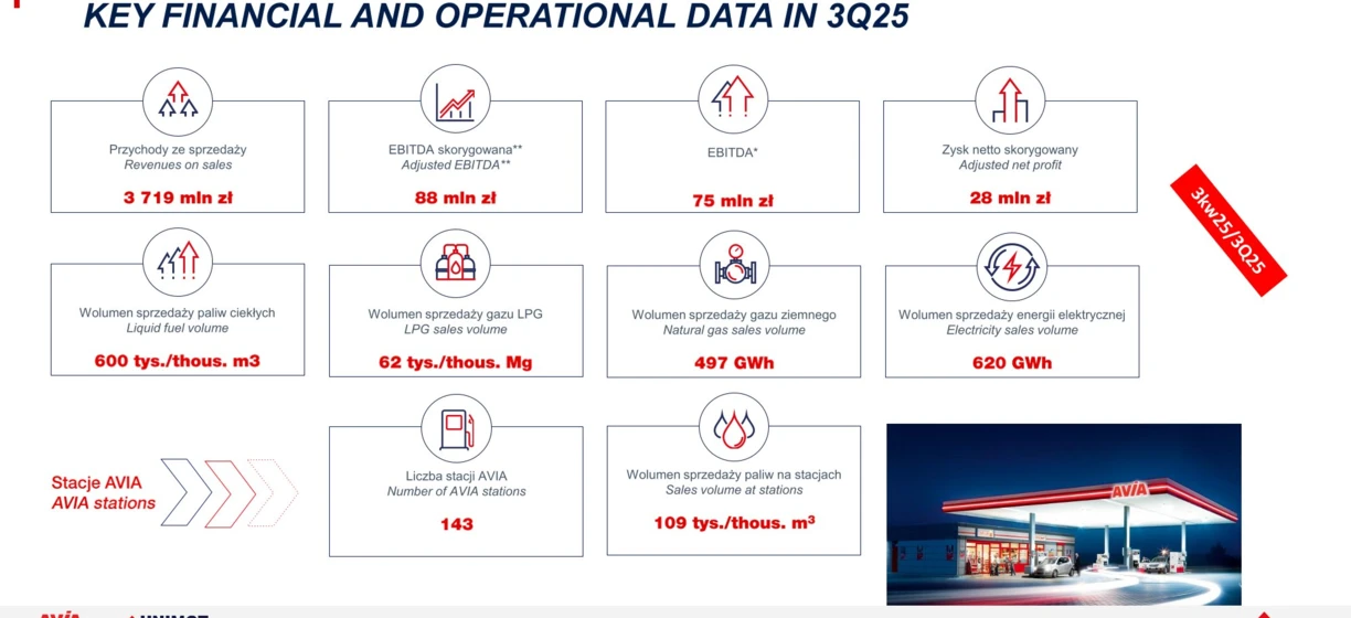 Jeśli chodzi o wyniki operacyjne, Grupa Unimot wypracowała w III kwartale 2025 r. wolumen sprzedaży paliw ciekłych na poziomie 600 tys. m sześc., wolumen sprzedaży gazu LPG na poziomie 62 tys. ton, wolumen sprzedaży gazu ziemnego na poziomie 497 GWh i wolumen sprzedaży energii elektrycznej na poziomie 620 GWh. Na koniec III kwartału 2025 r. w sieci AVIA działało 143 stacji, a wolumen paliwa sprzedanego na stacjach wyniósł w raportowanym okresie 109 tys. m sześc.